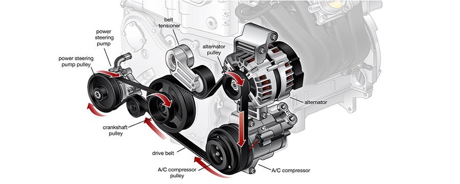 • به حرکت درآوردن قطعات جانبی: علاوه بر دینام، تسمه دینام قطعات دیگری مانند پمپ هیدرولیک فرمان، کمپرسور کولر و واتر پمپ را نیز به حرکت درمی‌آورد. این قطعات برای عملکرد صحیح سیستم‌های مختلف خودرو مانند سیستم فرمان، سیستم خنک‌کاری و سیستم تهویه مطبوع ضروری هستند.