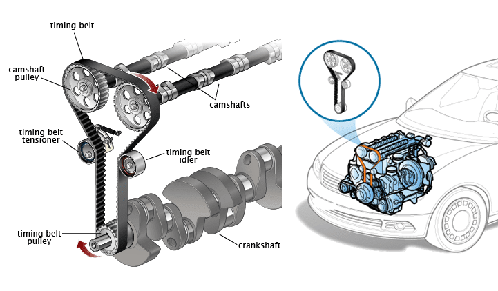 • انتقال نیرو: تسمه تایم با چرخش میل‌لنگ، نیروی چرخشی را به میل‌سوپاپ منتقل می‌کند.