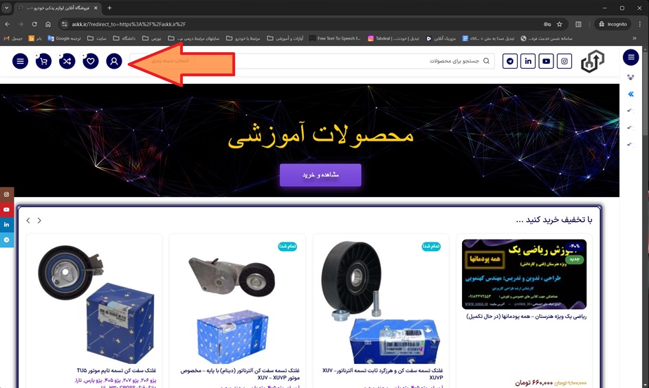 اولین گام برای خرید کالا یا فیلمهای آموزشی از ASKK.IR ، ثبت نام در وبسایت است. برای این کار بر روی عکس «حساب کاربری» که در بالای صفحه قرار دارد، کلیک کنید و دکمه ورود را بزنید تا وارد محیط ثبت نام شوید.