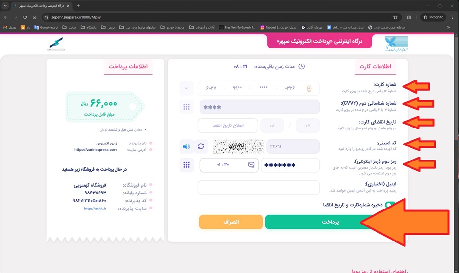 نام فروشگاه (فروشگاه کهنمویی باشد) و آدرس سایت پذیرنده (askk.ir باشد) را بررسی نمایید.