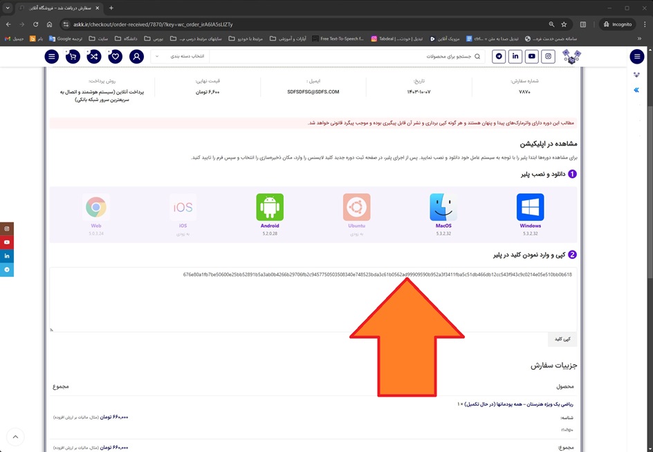 کد اختصاصی خود را در صفحه پس از پرداخت انتخاب نموده (این کد در این قسمت نیز نمایش داده می شود ، بر روی این متن کلیک کنید تا وارد این صفحه شوید) و در پلیر و در قسمت لایسنس وارد نموده و کلید تایید را بزنید.