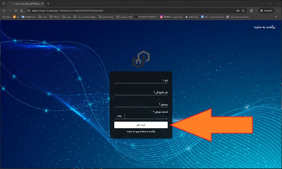 بر روی دکمه ثبت نام کلیک کنید و سپس در صفحه بعد اطلاعات خواسته شده را وارد نموده و کد تایید پیامک شده را ثبت نمایید.