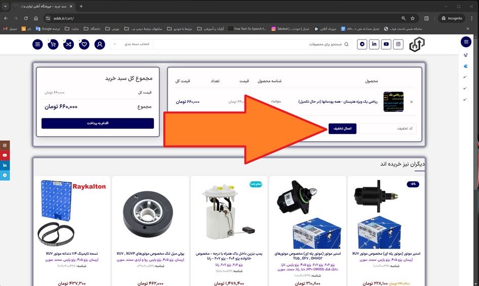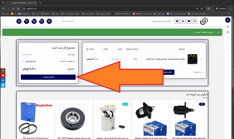 در این صفحه اطلاعات سبد خرید نمایش داده می شود ، اگر کد تخفیفی دارید در قسمت نمایش داده شده آن را وارد نموده و بر روی دکمه «اعمال تخفیف» کلیک نمایید تا تخفیف شما اعمال گردد سپس جهت پرداخت روی گزینه «اقدام به پرداخت» کلیک نمایید.