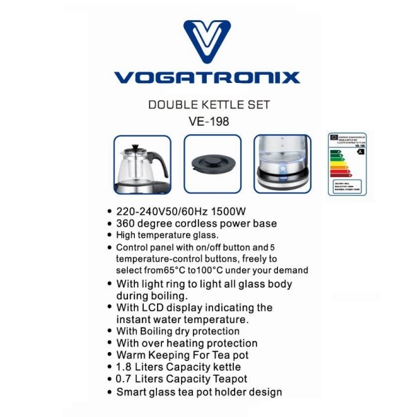 چای‌ساز روهمی وگاترونیکس مدل VE-198 با توان 1800 وات یکی از محصولات باکیفیت این برند است که با کتری 1.8 لیتری و قوری 1 لیتری، چای خوش‌عطر و طعمی را در کمترین زمان برای شما فراهم می‌کند. کتری این دستگاه از جنس استیل بادوام و مقاوم ساخته شده و قوری آن نیز از شیشه پیرکس نشکن و باکیفیت طراحی شده است که روی هم قرار می‌گیرند. این مدل دارای سیستم گرم نگهدارنده است که نوشیدنی را در دمای ایده‌آل حفظ می‌کند. علاوه بر این، چای‌ساز VE-198 مجهز به سیستم قطع خودکار است که علاوه بر ایمنی، سرعت و راحتی بیشتری را به کار شما می‌بخشد.